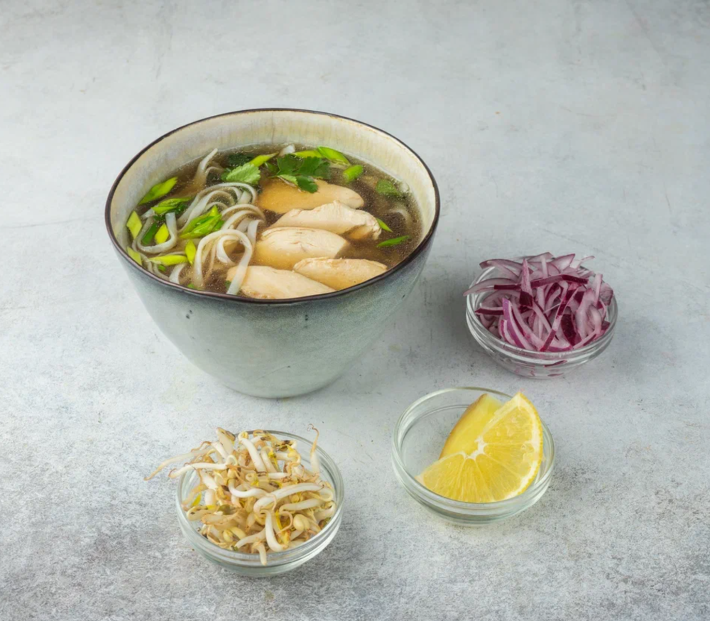 Этот суп - настоящий шедевр азиатской кухни. В нём сочетаются насыщенный мясной бульон с пряностями, обжаренное филе цыплёнка, упругая рисовая лапша и яркие акценты в виде маринованного лука, соевого соуса, лимона, имбиря, зелени и бобовых ростков. Идеальный баланс вкусов и текстур, который порадует гурманов.