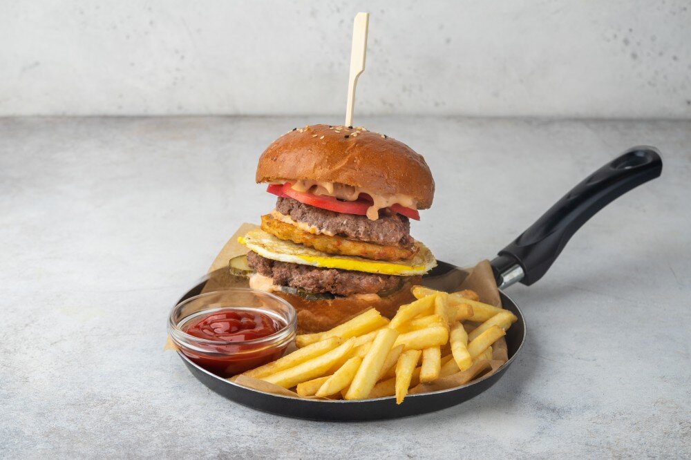 Этот бургер относится к категории блюд, которые стоит попробовать. Сочная двойная говяжья котлета с жареными яйцами, свежие томаты и огурчики маринованные, драник и фирменный соус 1000 островов, — попробуйте сочетание вкусов в этом бургере. Подаётся с картофелем фри.