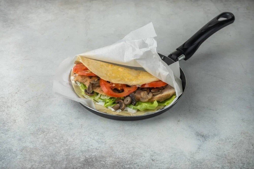 Это сытное блюдо точно понравится тем, кто любит пробовать что-то новое. Сочетание нежного обжаренного филе цыплёнка,свежих томатов, грибов и сметанного соуса на мягкой лепёшке создаёт богатый и гармоничный вкус. Хрустящий свежий салат добавляет контрастную нотку. Сливочное масло придаёт блюду приятный аромат.