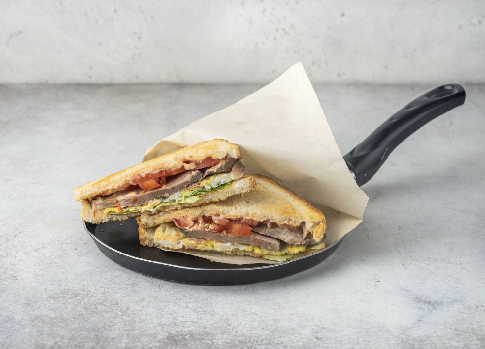 Сэндвич с сочной начинкой из обжаренного утиного филе, ломтиков томата и яиц. Фирменный соус добавляет вкусу насыщенность, а свежесть сэндвичу придаёт хрустящий айсберг. Пшеничный хлеб приятно оттеняет каждый ингредиент.