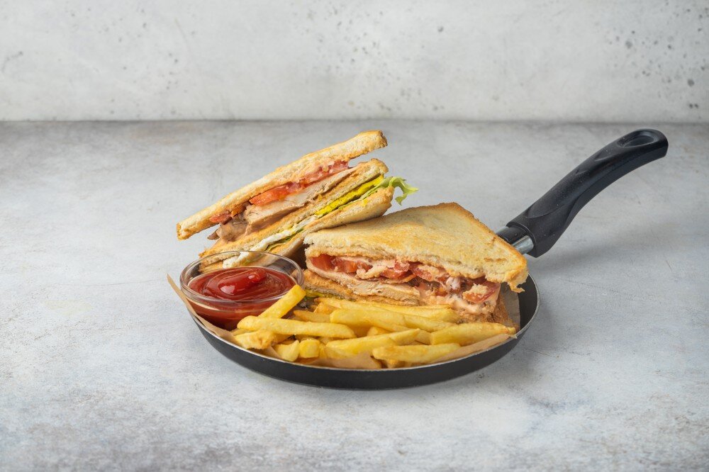 Ищете сытный и вкусный перекус? Тогда вам стоит попробовать наш сэндвич-клаб. Сочная куриная грудка, ароматный бекон, свежие овощи, сыр чеддер и фирменный соус 1000 островов - всё это на мягком пшеничном хлебе вместе с порцией хрустящего картофеля фри.
