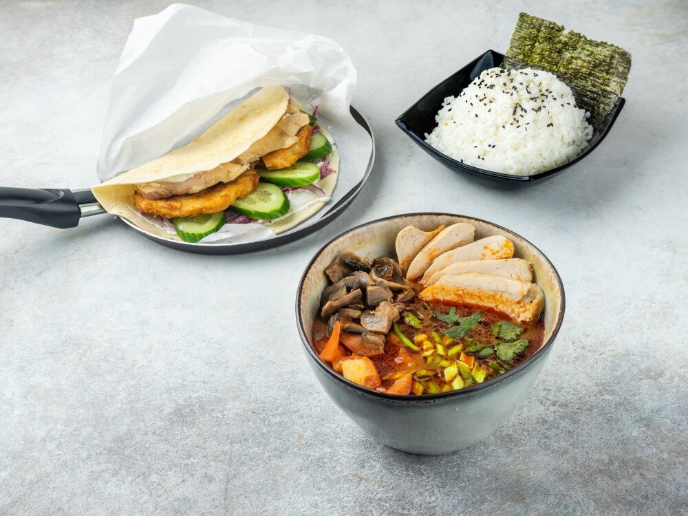 Том ям с цыпленком, пшеничная лапша с соевым соусом и курицей